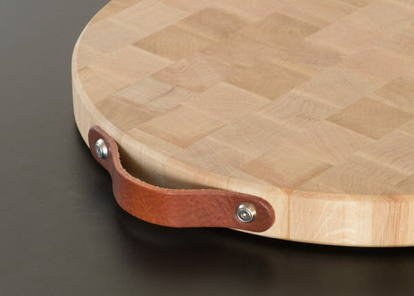 Les Billots de Sologne ®Billot à poser, en charme de forme ronde, assemblage bois de bout. Avec poignée en lanière de cuir.