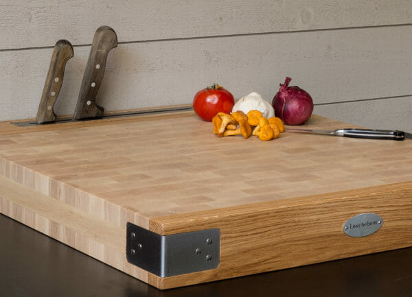 Billot professionnel de cuisine en charme, à caler sur plan de travail. Assemblage bois de bout avec façade en chêne naturel de 10 cm de hauteur.