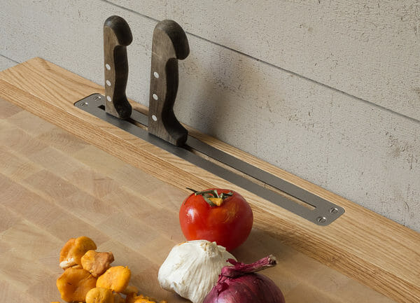 Louchebem®Billot de cuisine en charme, assemblage bois de bout avec parements en chêne. A l’arrière, alèse de 7 cm avec plaque porte-couteaux en inox (coutelière). Spécial Cuisiniste.