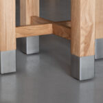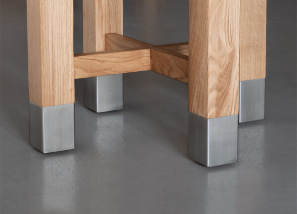 Les Billots de Sologne ®Plot de boucher rond composé d’un billot en charme massif, assemblage bois de bout, ceinturé par un cerclage vissé. Fixé sur 4 pieds en chêne.