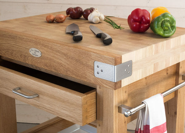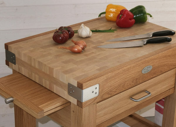 Billot de cuisine pour découpe et préparation en îlot central. Décoration avec une ceinture en cœur de chêne brun reprise par les équerres d'angle.